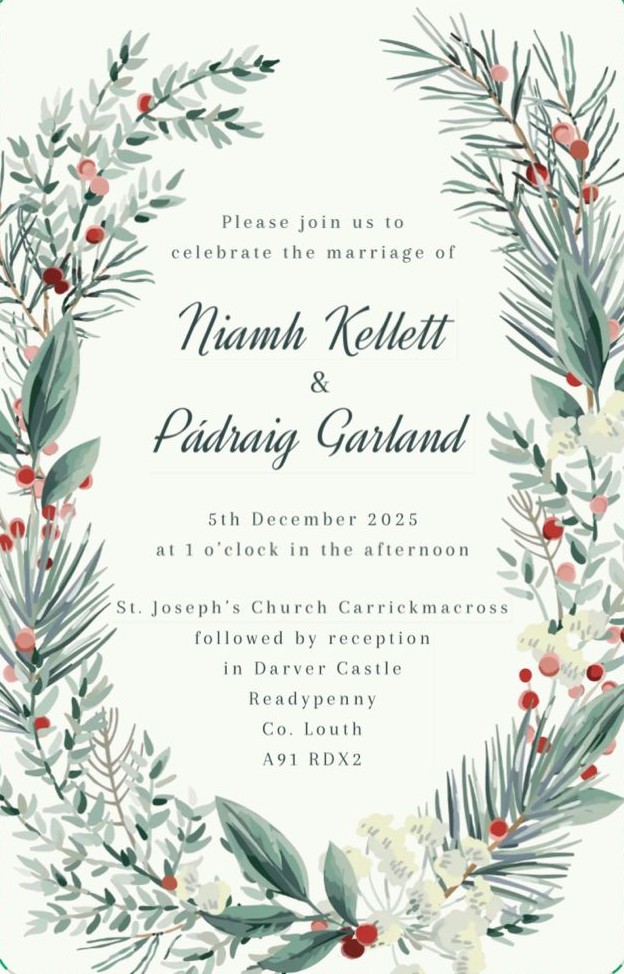 The ceremony will take place at 1:00pm at St. Joseph's Church, Carrickmacross, co. Monaghan.